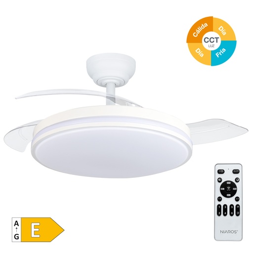 Ventilador techo Nicosia con luz CCT regulable y mando Ø107 3 aspas retráctiles DC Blanco